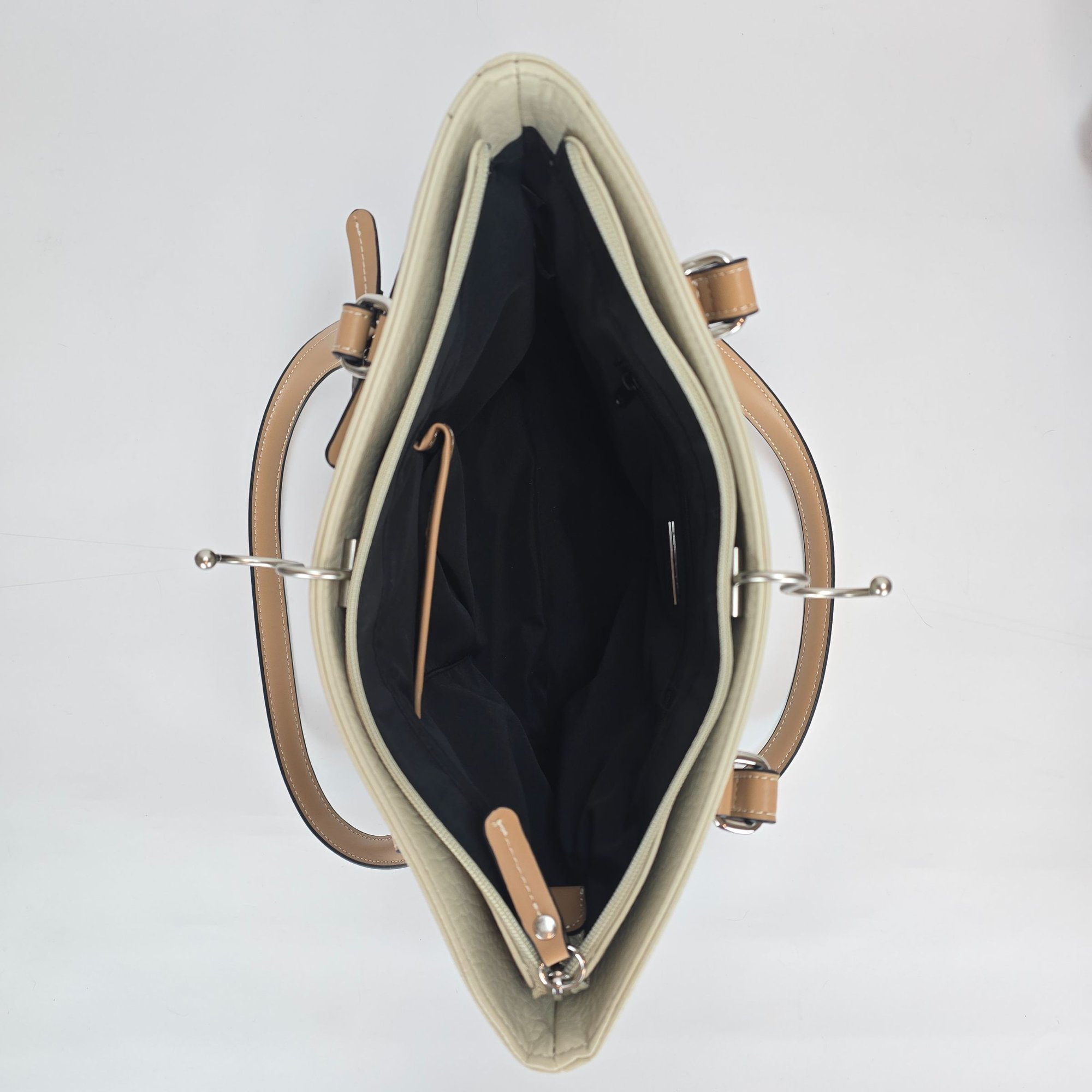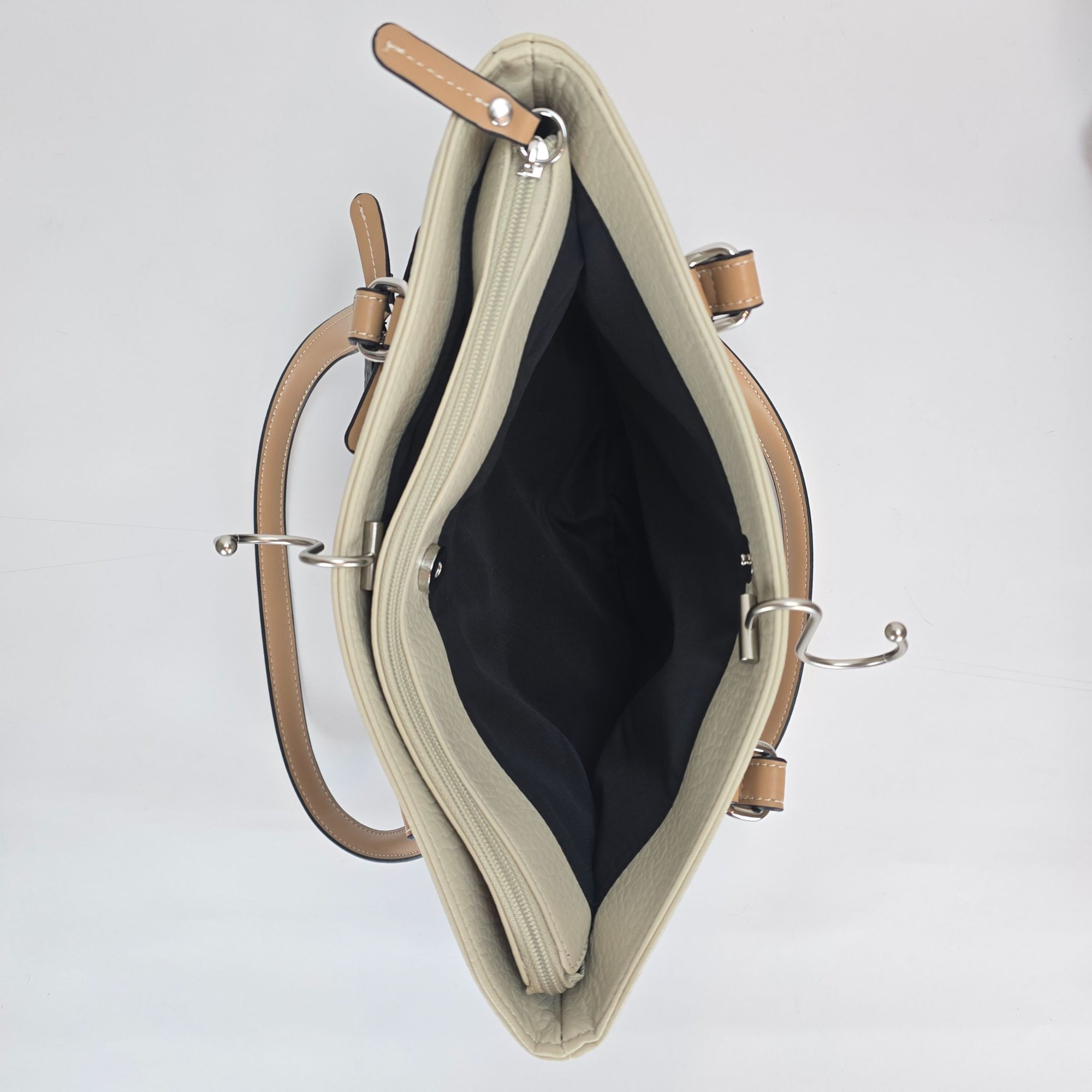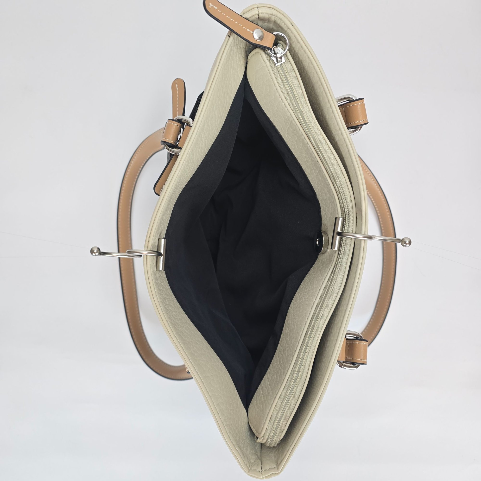 2 interior magnetic snap pocket compartments, 1 center zip pocket, 1 cell phone pocket & 1 back wall zip pocket