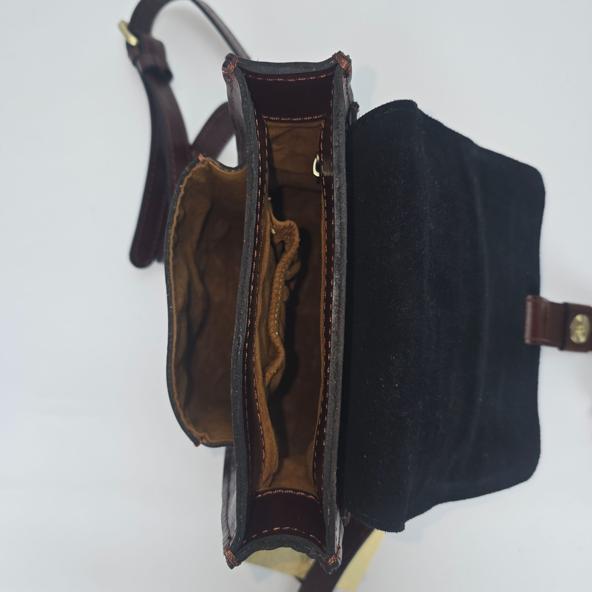 Signature brushed metal hardware, heavy handcrafted stitching